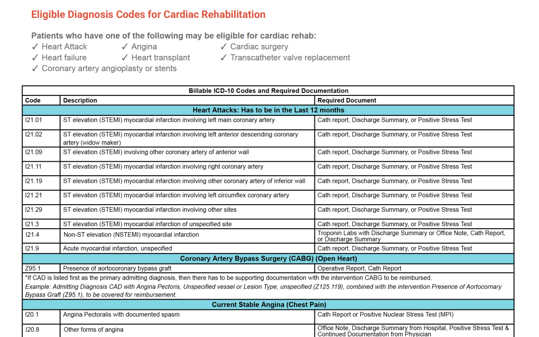 An easy guide with eligible diagnosis codes for cardiac rehab.